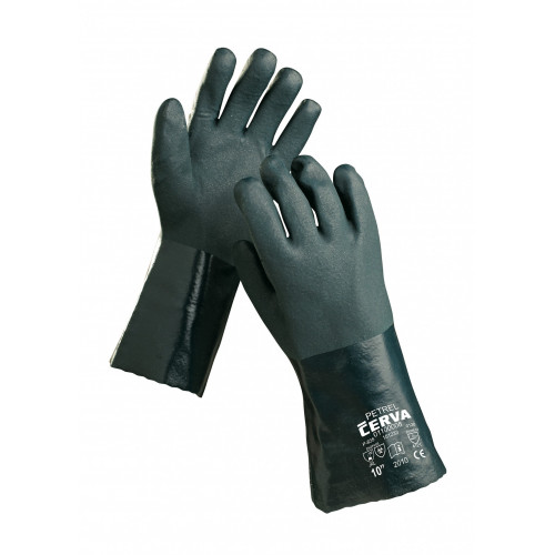 Захисні хімічно стійкі рукавички PETREL на бавовняної основі з повним покриттям ПВХ.Висока механічна міцність.